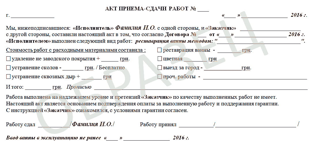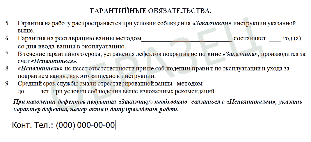 После того, как мастер окончит работу по реставрации Вашей ванны он обязан предоставить акт выполненной работы и гарантийный талон